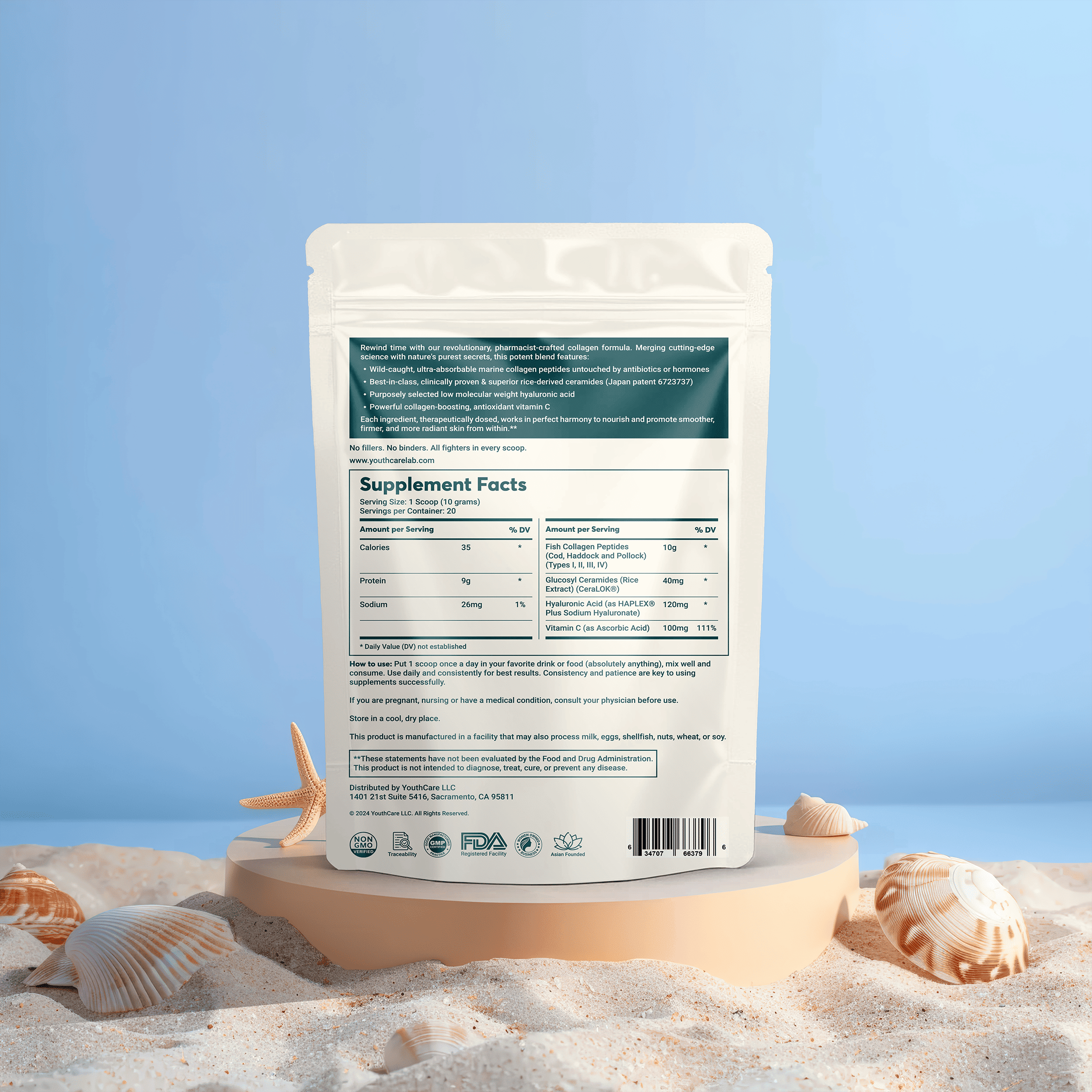 Fish Collagen Peptides (Types I, II, III, IV) 10,000 mg; Glucosyl Ceramides (Rice Extract) (CeraLOK®) 40 mg; Hyaluronic Acid (HAPLEX® Plus Sodium Hyaluronate) 120 mg; Vitamin C (Ascorbic Acid) 100 mg